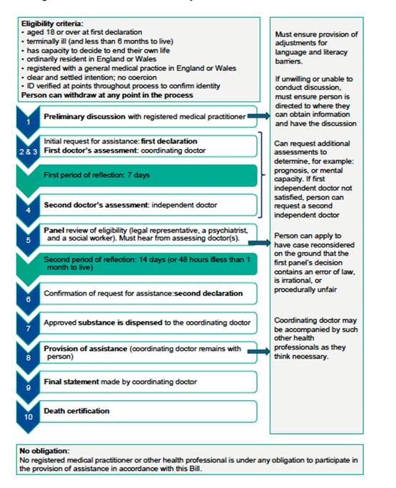 A comparison can be made by the eligibility criteria in the Bill (above) and those proposed by Lord Wilson in Nicklinson at [205]. In the Bill, the ‘gateway’ provision appears to be the diagnosis of a terminal illness with a life expectancy of less than 6 months. Whilst those engaging with the individual under the Bill must explain to them appropriate palliative, hospice or other care, and offer to refer them to a practitioner who specialises in such care for the purpose of further discussion, Lord Wilson’s list of factors is arguably more holistic.